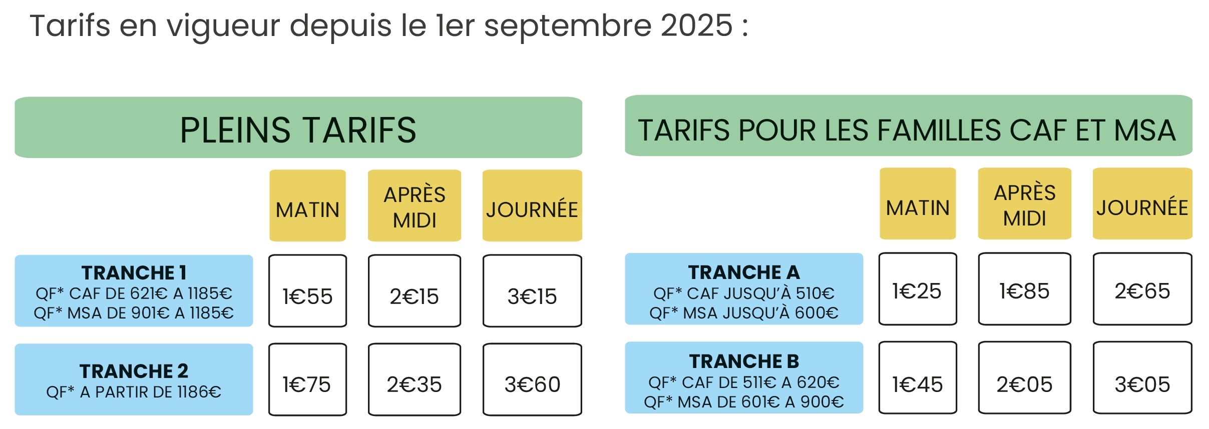 La tarification est également harmonisée sur tous les sites, quelque soit le temps passé par les enfants. La grille tarifaire prend en compte les revenus des familles.